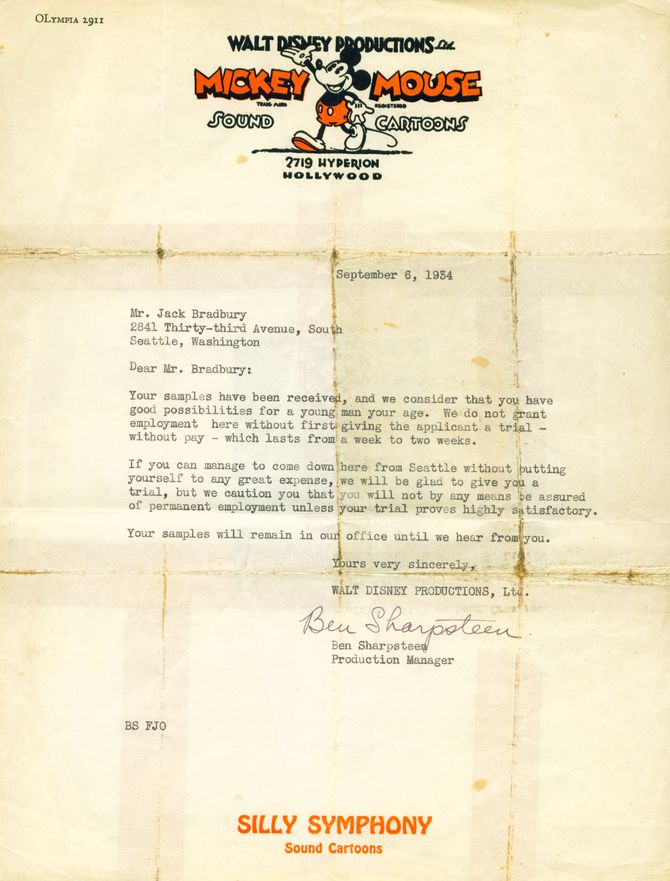 [This excerpt starts about a year after Jack graduated from high school. He had just returned home to Seattle, from a job thinning apples in Chelan, Washington.] Back home once more, with absolutely no prospect of a job in sight, things looked grim indeed. I was beginning to understand what my poor father had been going through for too long. The anguish of being unable to find much needed work could soon lead to despair. Before going to eastern Washington, I had looked everywhere for work and had begun to feel pretty hopeless, where else could I look? It was out of desperation that I had taken the job thinning apples, rather than sit at home idle, but I had been able to send part of my earnings home. Every bit helped. One sunny Sunday a few weeks later, having nothing better to do, I went out to Longacres [race track], just to watch some beautiful animals in action. I don't recall whether it was one of those free admission days, or whether I had a pass, for I wouldn't have been out there otherwise. Another neighbor, the sports editor of The Star, sometimes gave us freebies. At the track I ran into some friends who had been to the 5th Avenue Theatre the night before and were raving about a new cartoon they'd seen, Walt Disney's "Three Little Pigs". "Be sure and see it, Jack," they said. Needless to say, I managed to see it as soon as possible. And in the days following, everyone in town seemed to be singing that catchy tune from the picture, "Who's afraid of the Big Bad Wolf?" Ben Sharpsteen, a director from the Disney studio, had recently visited friends in town, telling them about Disney's great need for new talent, he was planning to build up his staff and produce a feature length cartoon. My sports editor friend passed the word on to me. Well now, this sounded almost providential to me. It wouldn't cost more than a 3 cent stamp to write and find out about this, something that could be the opportunity of my lifetime. With no job prospects whatsoever, you can imagine how something like this would give me hope. I sat down immediately and wrote to the studio, enclosing samples of some recent work. There were no cartoons among them, just a few wash drawings: A proud aged Indian, a dog, the head of Primo Carnera, the giant Italian boxer, and several others I can't recall. Not an impressive lot, but I hoped they could tell from these whether or not I had any talent for their kind of work. [art samples] For more than ten days I waited impatiently, not knowing if I'd get an answer or not. But one did come, and while excitedly reading it, a wonderful glow of hopeful optimism came over me. The letter said to come down and "try-out" for two weeks, at my own expense, of course. I was cautioned to have enough money to live for the two weeks and enough to get home, in case I failed to qualify. [letter] That seemed fair enough. The "fail to qualify" part was sobering, but I now knew I had to go to California and see whether I could make cartoon movies or not. This sudden, wonderful opportunity coming out of nowhere seemed like an improbable dream, but pinching myself, OUCH! convinced me I was not only awake, but also sensitive to pain. I was ready to leave immediately, my only problem was...no money. Checking bus fares, I found they were cheap enough, but living expenses for two weeks would cost a little...I was pretty sure I could do it all for about 50 bucks. Apparently I was the only one in the family excited by this very sudden and rather questionable opportunity that would cost the family fifty dollars...dollars we did not have.... Dad wrote to his father, and by return mail came the money. WOW! Now I really was going to California! Whether I made it or not would depend on me now and I was prepared to give this big chance everything I had. No one outside of the family was told of my plan to leave town, then I wouldn't have explanations to make if I came back jobless. [describes the bus trip south]...